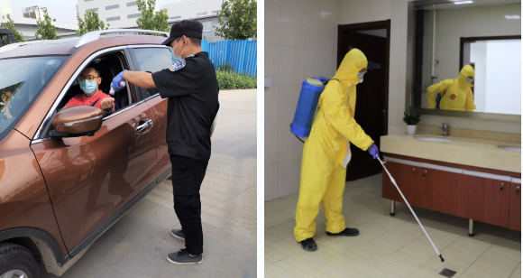▲进入厂区有专人进行体温测量与登记(左);对厂区及办公区各个角落严格消毒(右)