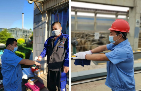 ▲进入厂区加强体温监测与登记(左);厂区内部加强消毒工作(右)