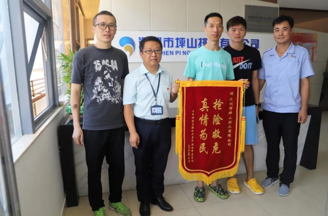 6月12日,深圳市坪山区石井街道马鞍岭村居民赖金强、李东成、李海鸿送来写有“抢险救危,真情为民”的锦旗,表达对北排深圳坪排公司心系百姓、忠于职守,坚持接诉即办、为民排忧解难的感谢之情。