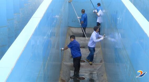 近日,记者在东、西两座供水厂看到,作业人员分班组进行冲刷蓄水池,反复擦洗池壁、池底,并用清水重复冲洗,清洗过程中投加漂白粉、双氧水进行消毒处理,整个过程专业、规范,确保供水水质干净安全。
