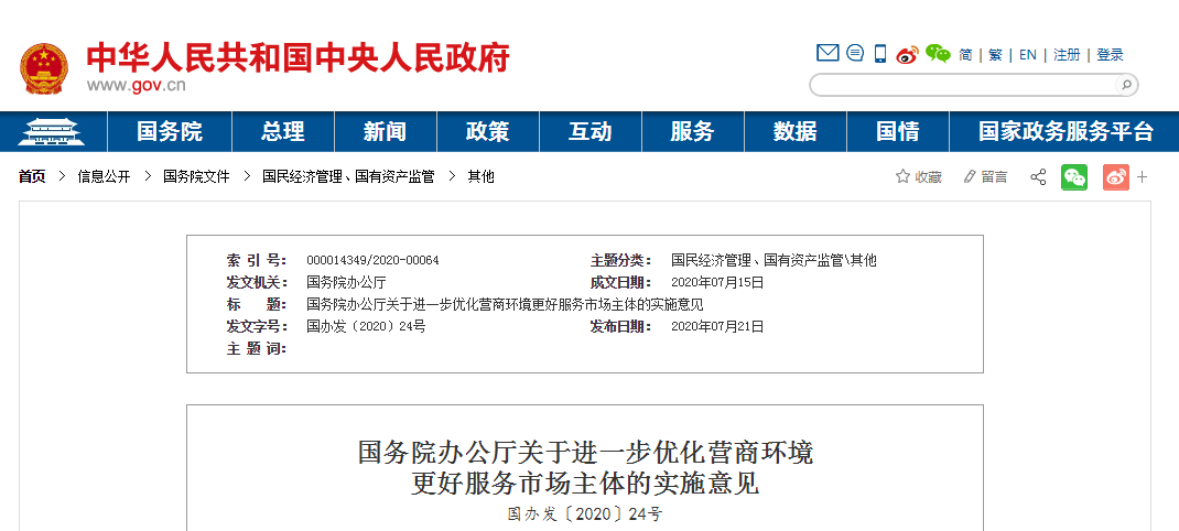 国务院办公厅印发关于进一步优化营商环境更好服务市场主体的实施意见