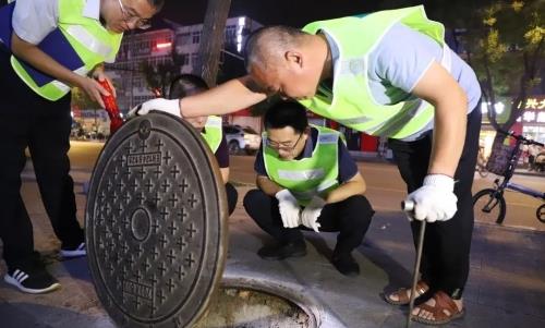 在查漏现场,巡查人员身穿反光背心,手拿手电筒、记录本,使用井盖移动专用钩子,逐一打开沿途的每一个下水道、排水井井盖,以望、闻、听等方式仔细查找漏水点。