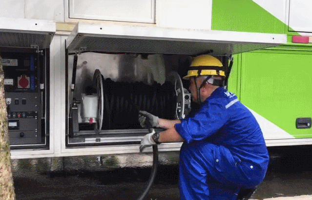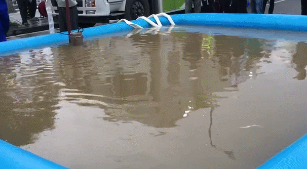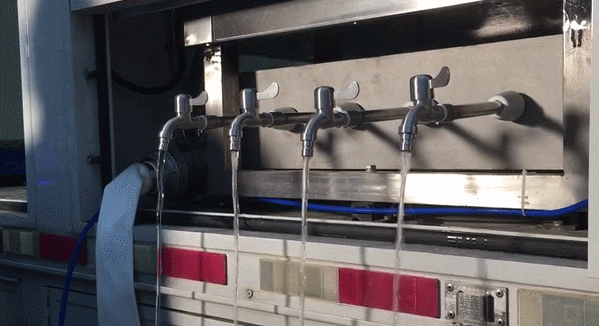 经过净水车层层过滤消毒后,河水变成清澈的自来水。