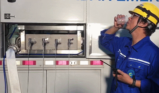 工作人员大口喝下刚刚过滤消毒的自来水。