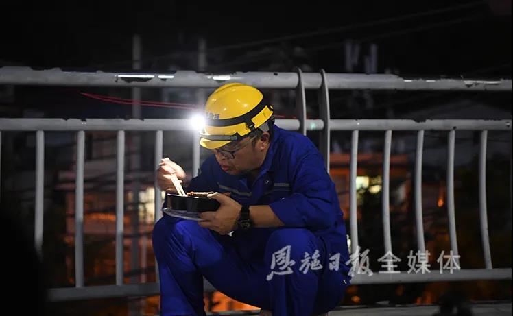 制水工作顺利开展后,应急救援队工作人员才抽空吃晚饭。