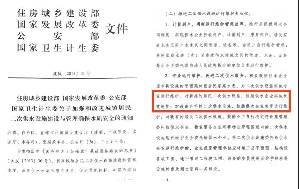 老旧小区二次供水存在设施缺失、建设标准不统一、管理不规范、管理缺位等方面的问题,在保障居民用水安全和水质保障等方面的矛盾日益突出。2015年,国家“四部委”出台了《关于加强和改进城镇居民二次供水设施建设与管理确保水质安全的通知》,明确提出城市公共供水企业作为保障水质安全的责任主体,要逐步推动形成权责明晰、管理专业、监管到位的二次供水设施建设与管理工作新局面,鼓励供水企业实施“统建统管”。