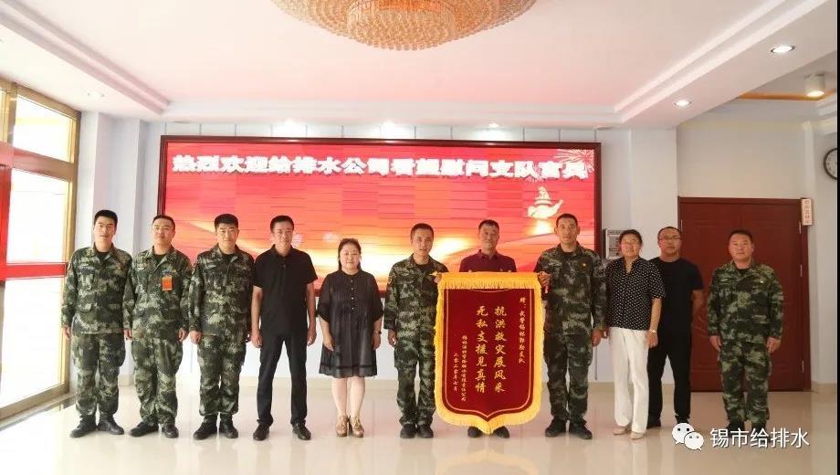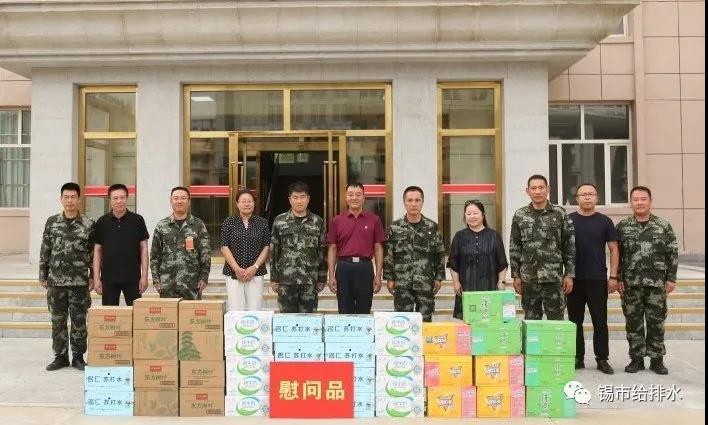 在武警锡林郭勒支队,邸龙耀副经理代表公司党总支将一面写有“抗洪救灾展风采,无私支援见真情”的锦旗及慰问品送到了武警支队领导手中,对部队官兵7月9日在污水处理厂抗洪救灾中无私支援表示感谢,并向广大官兵致以崇高的敬意和节日的祝贺。
