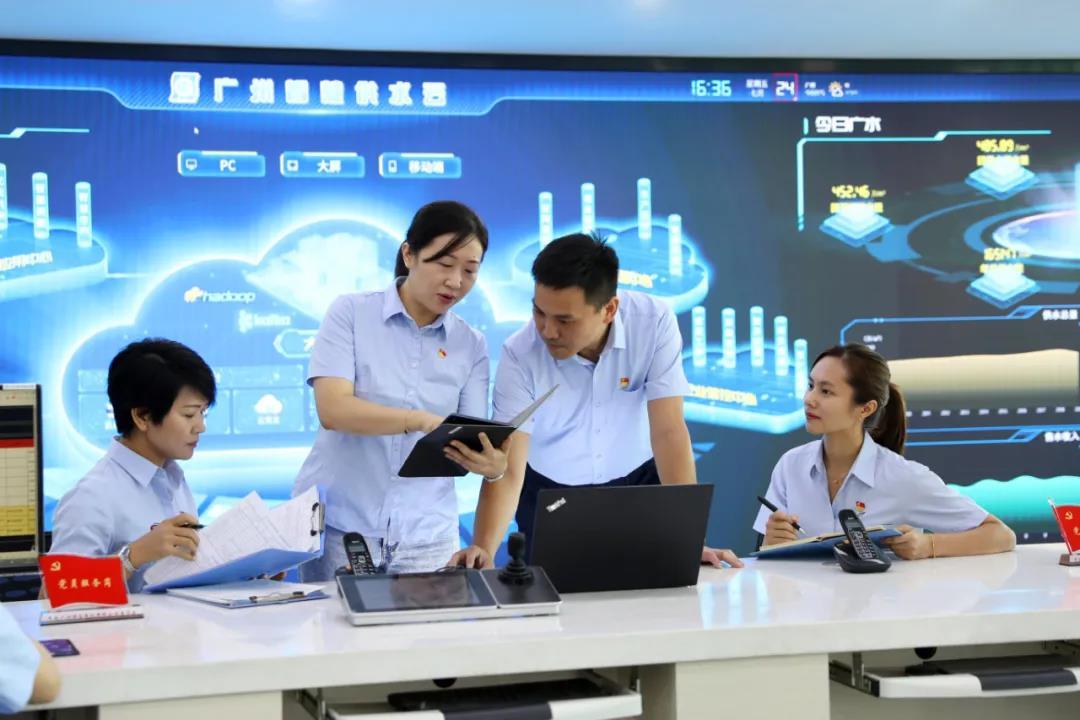 在广州自来水公司的调度大厅,工作人员通过智慧供水云平台能实时监测中心城区8间水厂、27座加压站的运行情况,并通过241个在线远传压力监控点和155个在线远传流量计实时监控分析市政供水管网的压力和流量以及各区域水量分布及使用情况,根据每日的供水峰谷情况合理调配进出水量,确保整个供水生产系统安全有序运行。