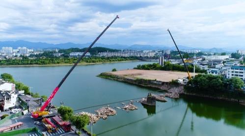 该段供水管道总长133米,总重约10吨,管道用支架与桥墩相连。要在不破坏桥墩及相关构件的前提下,安全平稳的拆除管道,技术上面临几大难题:①如何保护文物桥墩不受破坏?②管道横跨河面,如何完成切割?③管道如何平稳起吊?④如何保障现场人员安全?任何一个问题都是横在我们面前一道警戒线,是挑战也是考验。经过工作小组成员集思广益,多次论证并通过两次评审,最终确定采取两台450吨吊车分段整体吊装,两边分步施工的总体方案。同时对管道切割、切割人员输送方式、吊车起吊点确定、安全保障措施等各重难点问题,制定了专门措施及保障方案。