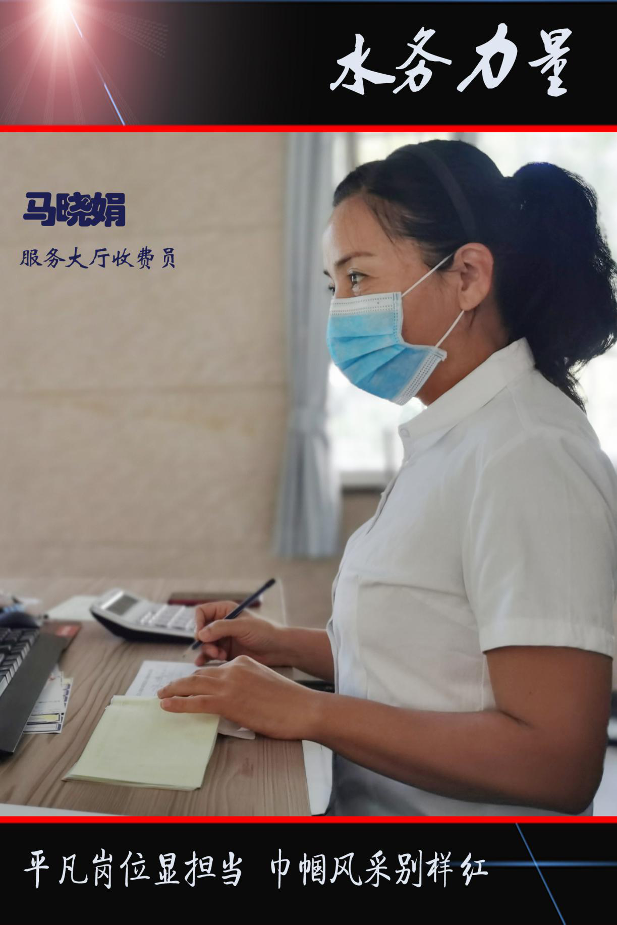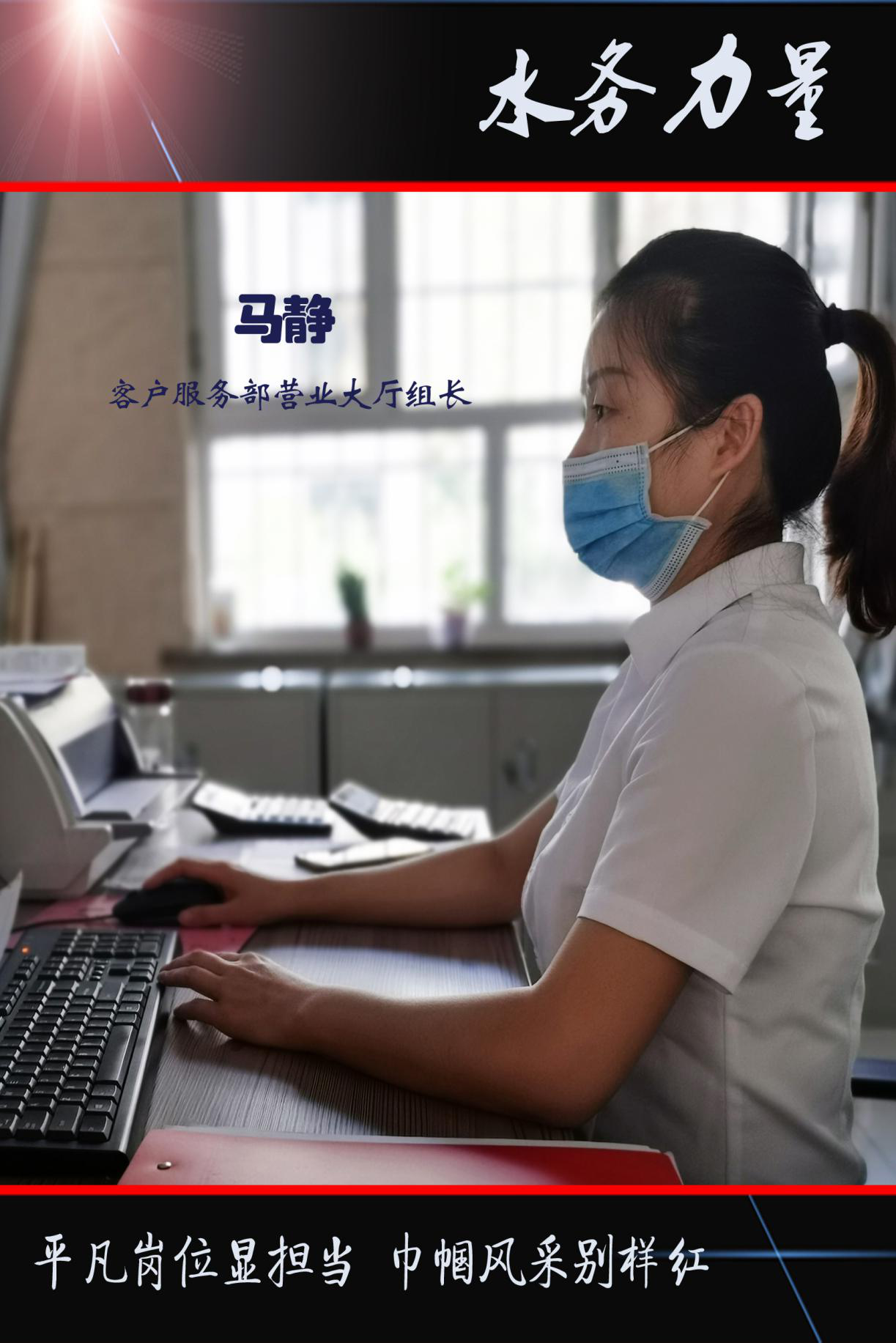 她们在业务大厅,年复一年,日复一日地坚守在工作岗位上,用至诚至真的微笑,精湛熟练的业务,践行着“全心全意为人民服务”的宗旨,展现新时代最美水务人的巾帼风采。