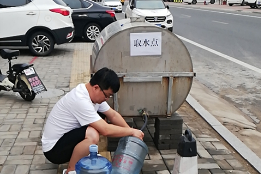居民在临时储水罐取水