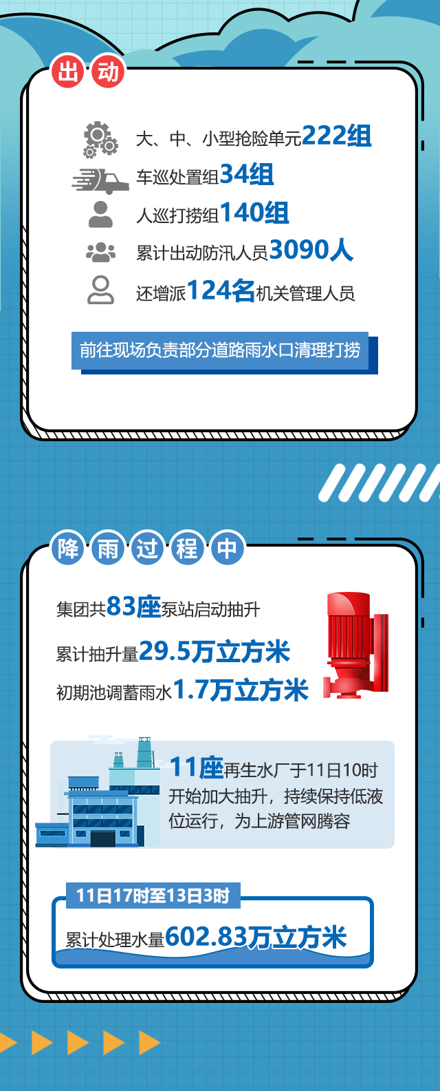集团根据气象台要求,于11日17时40分、12日11时分别启动防汛一级、特级响应。集团防汛指挥部指挥郑江、张建新到岗指挥,副指挥、防汛办公室及各分指相关人员到岗到位,集团所有泵站及水厂人员全部在岗。