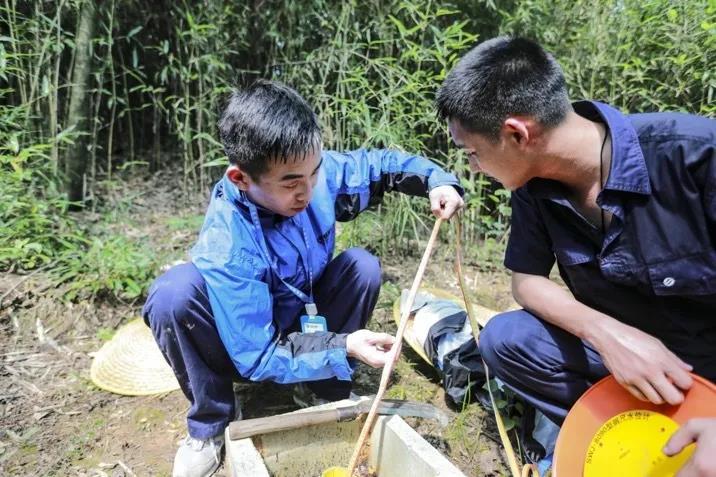 吴浩东在输水管道测压管中测量山体渗水水位