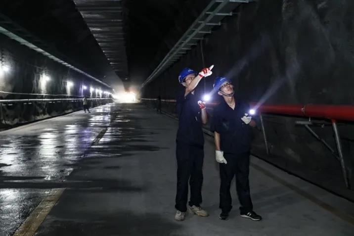 汪银涛(右)和戚红峰(左)在隧道中巡检