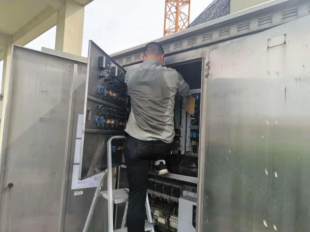 机修班长金斌和维修电工王家平配合排查排泥排水池控制柜故障。