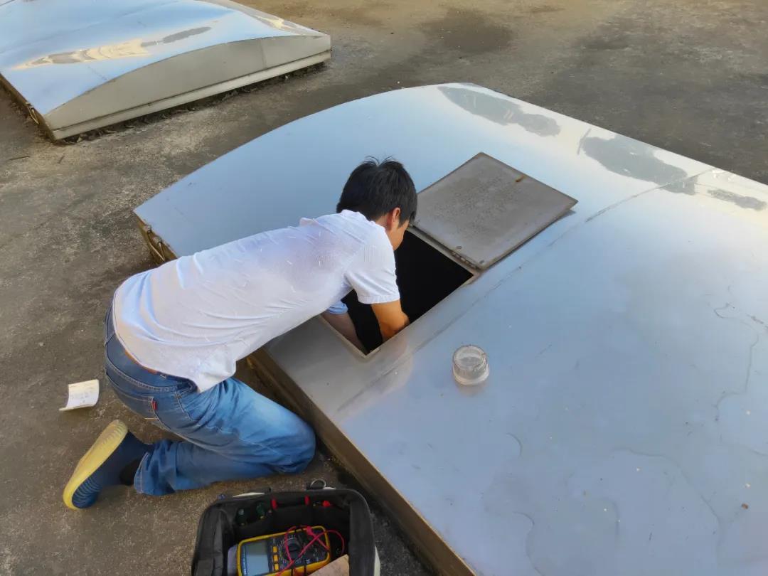 贯泾港水厂副厂长张刚对石英砂滤池液位仪进行维修更换。