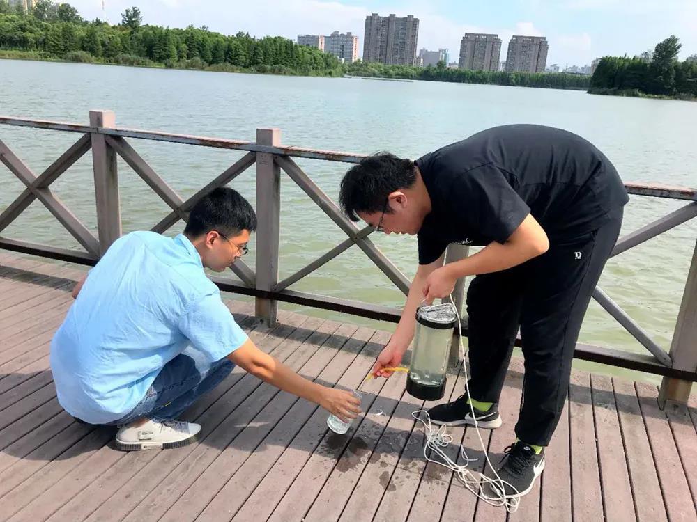 水质管理部都煜宇、吴房捷在高温下坚持对湿地水样进行采集检测。为保证高峰供水的水质安全,他们加大了对湿地水质的检测力度。