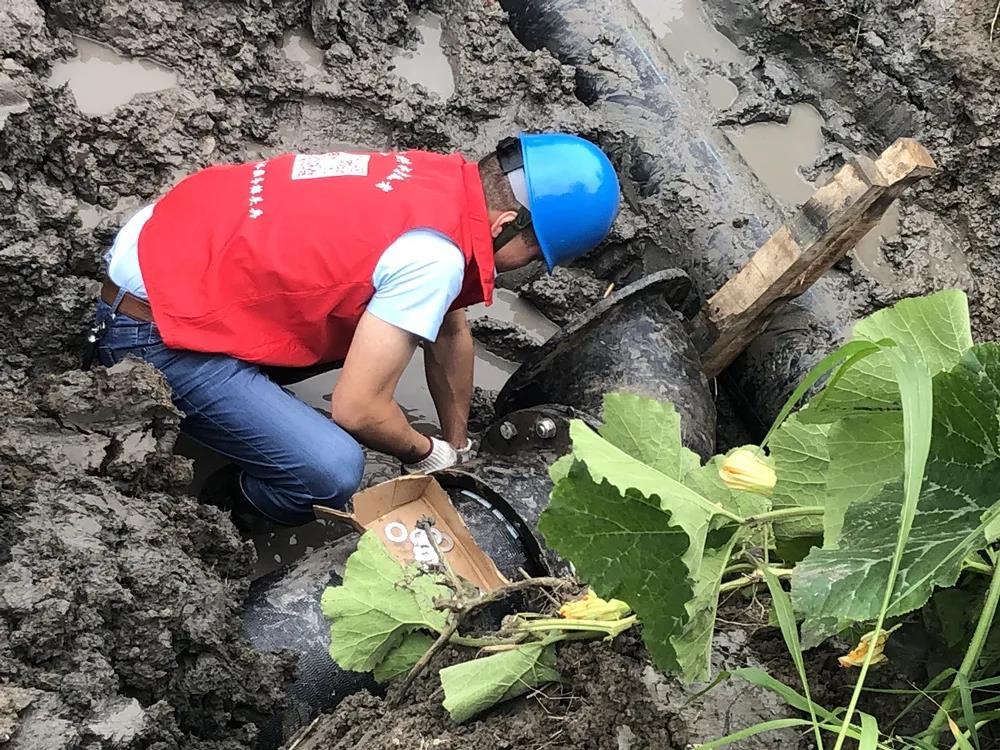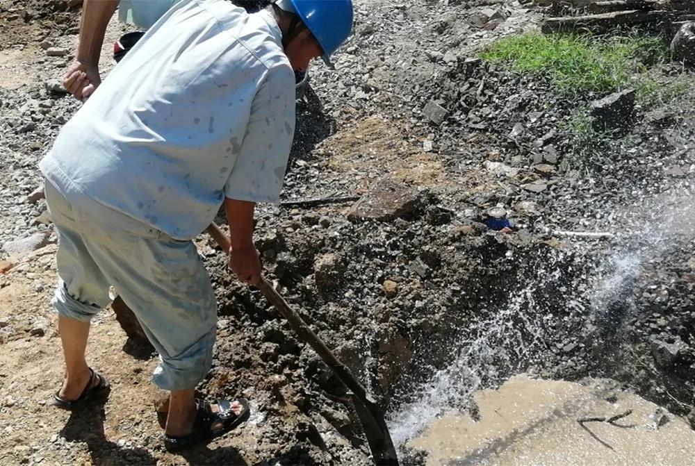 在大桥镇云东村,供水二分公司的刘荣明低头忙着抢修。