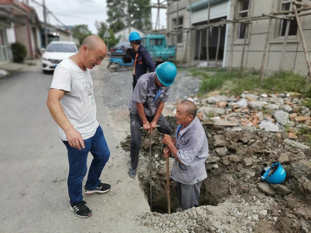 供水五分公司蚂桥服务站员工在九联村排查漏点,该村书记特地前来对自来水公司为民解决水压低困难表示感谢。