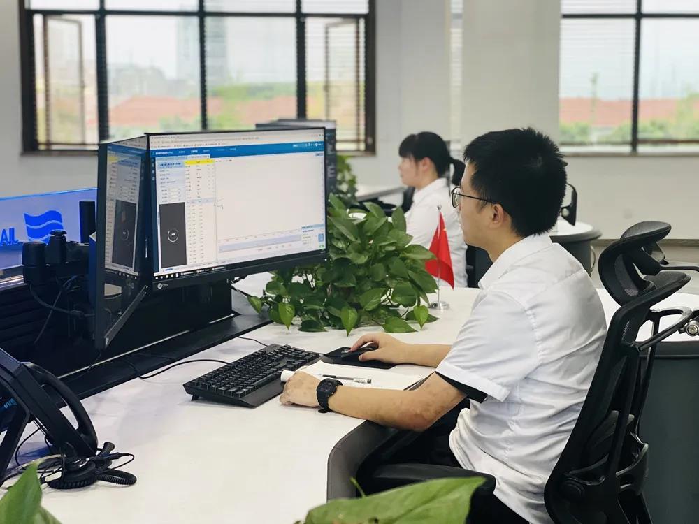 供水调度指挥中心的徐家骏、周丹正在操控智慧供水平台,指挥中心始终坚持开展科学的调度决策,尽量做到管网水量的平衡,改善局部区域用水情况,保证高峰用水安全。