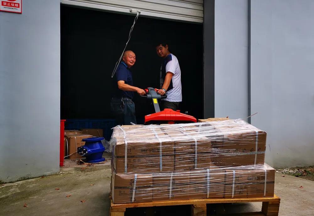 物资设备部范彧和装卸工冯师傅正在把阀门拉进仓库,液压车底座较低,仓库门口有斜坡,需要使劲拉车上去。