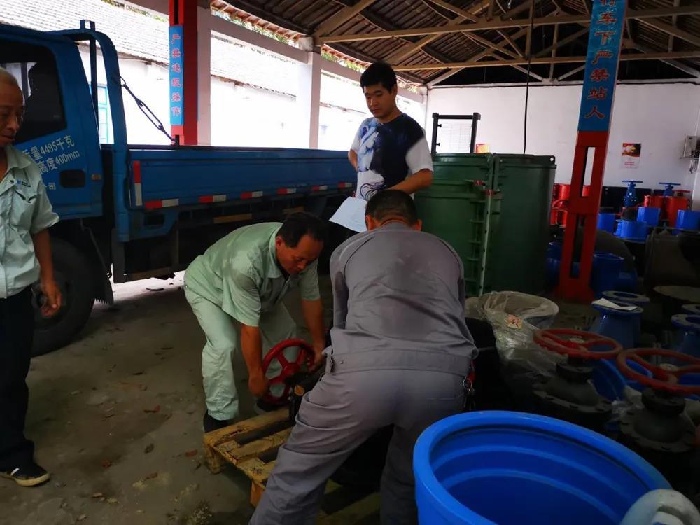 供水一分公司南湖营业所需要供水保障物资,洪金荣、尹家平两位师傅抬阀门装抢修车,汗水湿透了衣服。