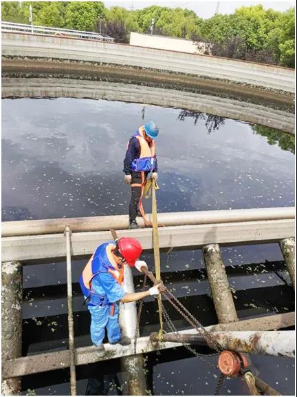 7月29日,污水处理厂SBR池滗水器推杆故障,无法出水。顶着35度的高温,维修人员光是站在SBR池边,就能感受到脚底传来股股热浪。由于维修工作还存在着危险性,维修时必须穿戴闷热的救生设备。短短10分钟,他们的眼睛已被汗水模糊,工作服已经湿透。经过两天的奋战,终于顺利完成了抢修,确保了污水的达标排放。