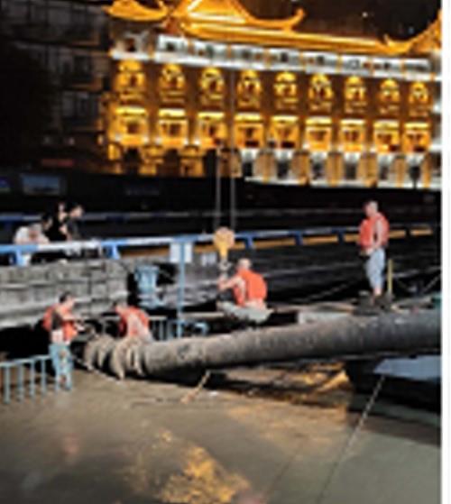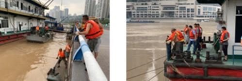 在得到洪峰预警的第一时间,采取积极措施防洪度汛:一是预案保障。江南水厂紧急启动防洪防汛预案,在高水位警戒时对生产、趸船定位、设备及后勤起到了保障作用;二是物资保障。为保障安全,切断了趸船高压10kv的生产用电,保留了380kv的辅助用电,同时应急发动机已到位,保障对绞绾和卷扬机动力不足时的正常供电。同时在已被洪水淹没的南滨路上重新建立一根对口钢丝对船舶进行加固,并把排架上的卷扬机和电器设备移动到安全位置,在退水后能恢复原位正常使用,恢复正常的生产秩序;三是人员保障。趸船班组6名职工及生产科科长全天候24小时进行值班值守,密切关注水位变化和船舶动态,进行联络接管和定位作业,避免险情发生;四是水质保障。制水车间密切关注原水水质情况,既要做好供水设施设备的安全管理,又要做好应对高浊度原水准备工作,保证水量不减,水质合格。五是提前准备饮用水,方便面等食物,对船上人员的生活做好后勤保障。