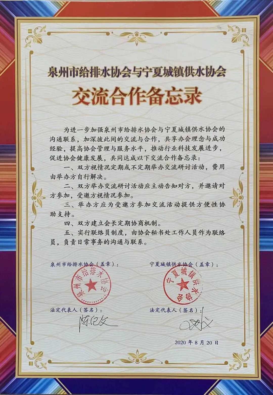 2020年8月20日福建省泉州市给排水协会陈纪文会长等一行七人来到宁夏城镇供水协会、银川中铁水务集团有限公司进行考察交流活动。协会会长王鸣义、集团公司总经理常晓梅、协会秘书长冯飞等人参加了本次交流会,会议中王鸣义会长向泉州水协的客人介绍了宁夏城镇供水协会的成立和发展历程,以及目前宁夏各市县的供水模式,由常晓梅总经理介绍银川中铁水务集团有限公司的现状情况。之后由陈纪文会长向大家介绍了泉州给排水协会的发展状况、业务范围等。