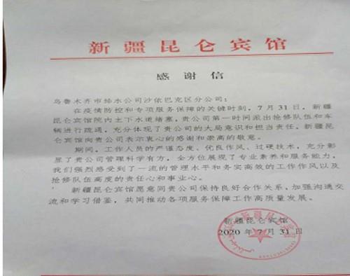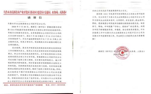 “感谢乌鲁木齐水业集团排水公司,在疫情防控期间在排水抢修方面的大力协助,为市民不断增强获得感、幸福感、安全感……”近日,排水公司收到来自高新区(新市区)建设局(交通局、水务局、人防办)和新疆昆仑宾馆的感谢信。