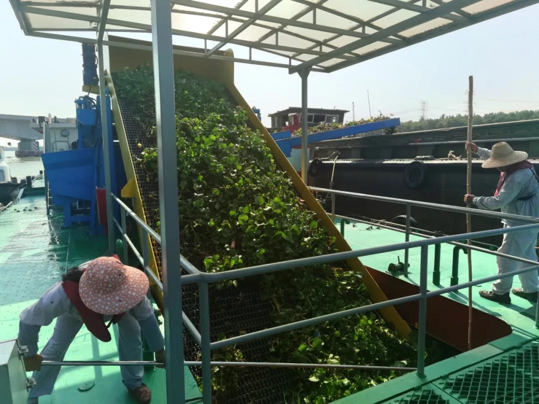 围堵拦截,守好苏州河水域第一道防线。由于气温适中,吴淞江上游河道内出现了大量水葫芦源源不断涌入苏州河干流。公司每日组织作业力量投入航扫打捞作业,结合江面水葫芦分部情况,针对上游泗江口、华漕等重点水域进行围堵和拦截,尽全力将水生植物歼灭在第一道防线。截止2020年9月2日,水域公司年度水生植物整治累计出动作业船舶3245艘次、作业人员10989人次、累计打捞水葫芦8806吨。在第三届进博会即将举办之际,水域公司全体职工上下一心、众志成城、坚守岗位,面对水生植物整治的重任,秉承高度的责任感与使命感,以碧水保卫为己任,为改善水域生态环境贡献城投力量。
