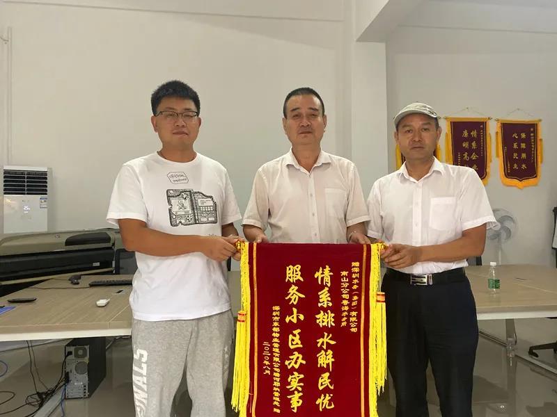 9月21日一大早,刚刚胜利完成抗击台风“红霞”工作任务,保障辖区平安度汛的南山分公司,收获了该小区管理处送来的一面绣着“服务小区办实事,情系排水解民忧”金色大字的锦旗。