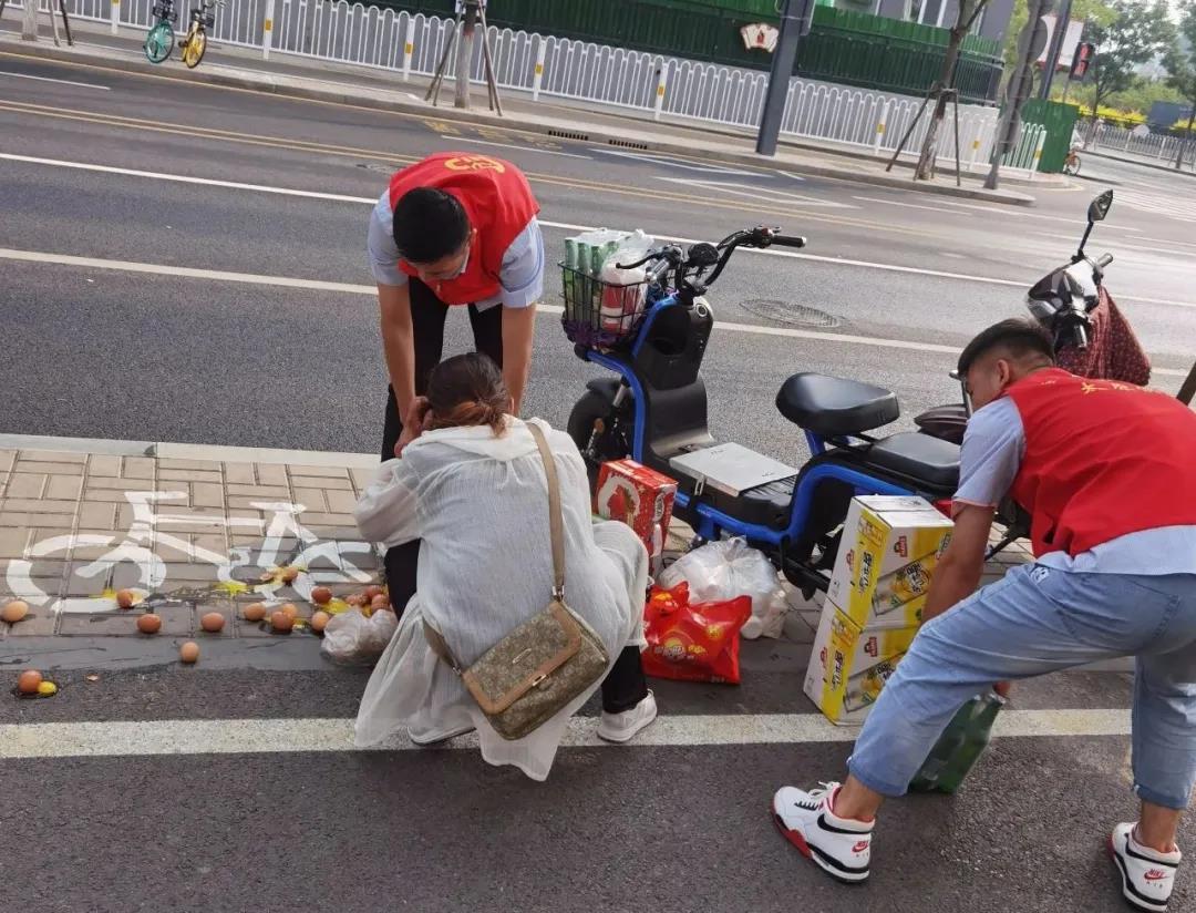 9月13日下午,志愿者郅钧婷、亢马强、王崇正在省府街责任区域进行志愿服务时,有一位大姐骑着电动自行车飞快地行驶,车子前后装满了刚刚从外面采购的生活用品,由于平衡未能掌握好,连人带车摔在马路上,辛苦采购的鸡蛋、饮料及生活用品散落一地,三人看到后径直跑上前,一把扶起了大姐,关切地询问她的伤势,并帮助活动手脚,擦去衣服上的污渍和鸡蛋液。所幸大姐没有大碍,只是有些外伤,可以继续行走。三名志愿者帮他扶起车子,又细心地将散落在地面上的物品整理好,绑在电动车上。看着大姐骑上电动车缓缓离开后,三名志愿者迅速将散落在地面的碎鸡蛋清理干净,确保路面的干净整洁,保证道路畅通。