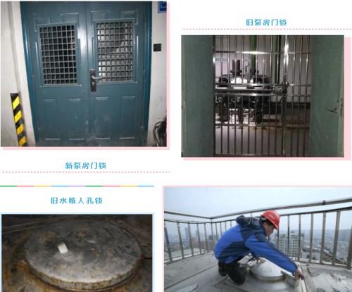 在546个泵房入口更换带电控锁的制式防盗门,将410只水箱人孔盖锁升级为磁柱防撬人孔盖,覆盖了所有二次供水泵房,确保泵房入口、水箱入口两个安防关键点安全可靠。