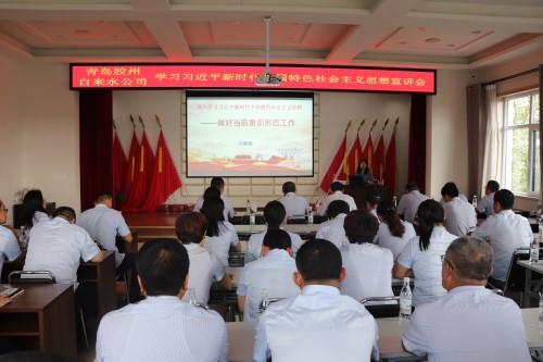 9月25日下午,青岛胶州自来水有限公司四楼会议室座无虚席,公司领导班子、中层干部、党员代表共65人一起聆听了胶州市委党校高级教师刘骏骎围绕《学习贯彻习近平新时代中国特色社会主义思想——做好当前意识形态工作》所作的专题辅导讲座。在两个多小时的辅导讲座上,刘骏骎老师以生动形象的语言、精辟严密的论述、渊博严谨的专业知识和丰富贴切的案例,结合国有企业实际,从多个方面对习近平新时代中国特色社会主义思想和意识形态工作进行解读,讲座主题鲜明、内容丰富、脉络清晰、讲解精准,既注重从理论上解读,又注重结合实际进行分析,对于深入学习领会习近平新时代中国特色社会主义思想、准确把握意识形态工作具有重要的指导和推动作用。