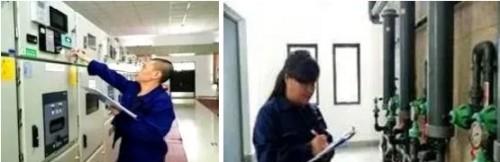 左图为盐龙湖水厂值班电工王华建在10KV开关站检查设备,右图为自来水生产运行工胥莉萍在加药间观察加矾泵运行情况。