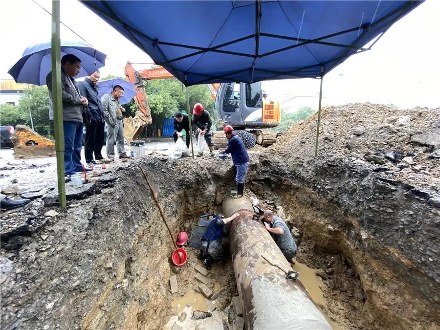 因雨天开挖、施工难度大,29日凌晨6点,在机械作业和人工开挖相互配合下, 150厘米长的破损水管在两米深的作业坑内开挖出来,现场抢修人员争分夺秒、兵分两路,一路现场继续开挖作业坑、清洗管道,另一路焊接烧制套筒。上午10点半,烧制好的抢修配件到达现场,抢修人员在管道上进行焊缝连接、填充物料、浇筑水泥……,15个小时不眠不休,冒雨连续奋战,于29日下午14点完成抢修,恢复供水。