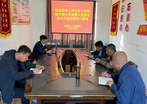 会上,主讲人管道维护二所党支部书记孙鹏亮主要就城市排水系统疫情风险点、风险类型和暴露途径、风险防控的要点、排水管网运行管理、城镇排水户排水行为管控、排水管网泵站运行管理、管网运行事故应急处理、管网运行管理过程产生固体废弃物处理、设施设备安全运行风险防范、疫情结束阶段防范事项几方面进行了详细讲解。