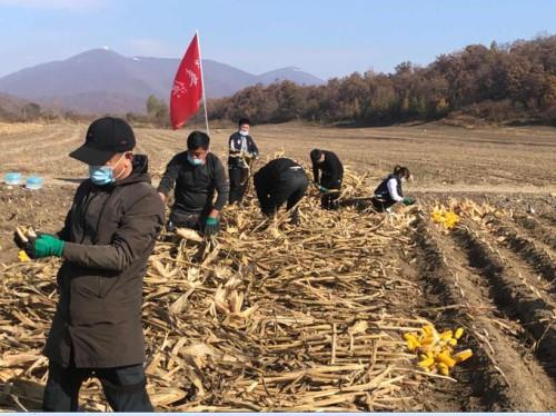 近日,供水公司珲春和市民政局党员志愿者服务队一大早就来到了包保村哈达门乡青山村。在秋阳下的地里,掀起了一场热火朝天的扒玉米竞赛热潮。大家也顾不上休息,渴了转身喝口矿泉水,饿了啃几个自带的干粮,经过大半天的努力,大家将其家的玉米全部扒完,虽然有的干部手上都磨出了泡、有的甚至被玉米叶划破了腿,但是大家都咬牙坚持,戏称“轻伤不下火线”,看到齐刷刷、金灿灿的玉米棒子在大家的齐心合力下搬运到农民家中,大家都终于吁了口长气,露出了笑容。对缺少劳动力的孙某一家来说,助农队的到来可谓是雪中送炭,他的妻子祖阿姨感动地说:“包村单位对我们真是太好了,不仅为我们讲解惠民政策,开春时候帮我们种地,现在还帮助我们秋收,有了党和政府的关心,我们的生活一定会越来越好!”