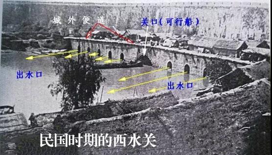 五代南唐时,秦淮河南段下游处(今凤台路北端)有一座下水门,这就是西水关的前身。到了明代,南京筑城墙时将下水门改建成西水关,设置偃月洞,洞分三层,共32券,上层11券,中、下层各十券,中下层的中间共一个大洞,可通舟筏。清代时,又在在下浮桥与偃月洞之间设有“银台洞”,又称“云台洞”。西水关和东水关一样,都为水闸码头,但西水关的繁荣景象,远胜于地处夫子庙之东的东水关。大诗人李白曾在此留下了“昨晚西城月,青天垂玉钩。朝沽金陵酒,歌吹孙楚楼”的诗作。