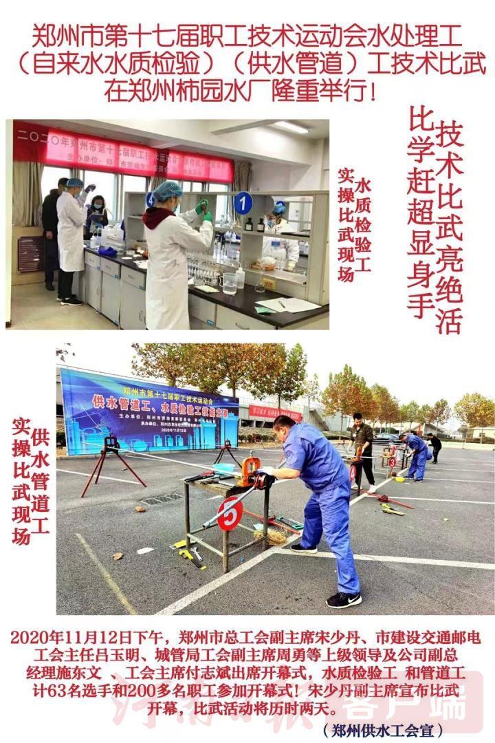 11月12日,由郑州市总工会主办,郑州自来水投资控股有限公司承办的郑州市第十七届职工技术运动会水质检验工、供水管道工技能竞赛在郑州市柿园水厂举行。来自全市水质检验、供水管道两个工种的60余名选手参加此次竞赛。