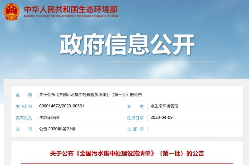 生态环境部发布2020《全国污水集中处理设施清单》