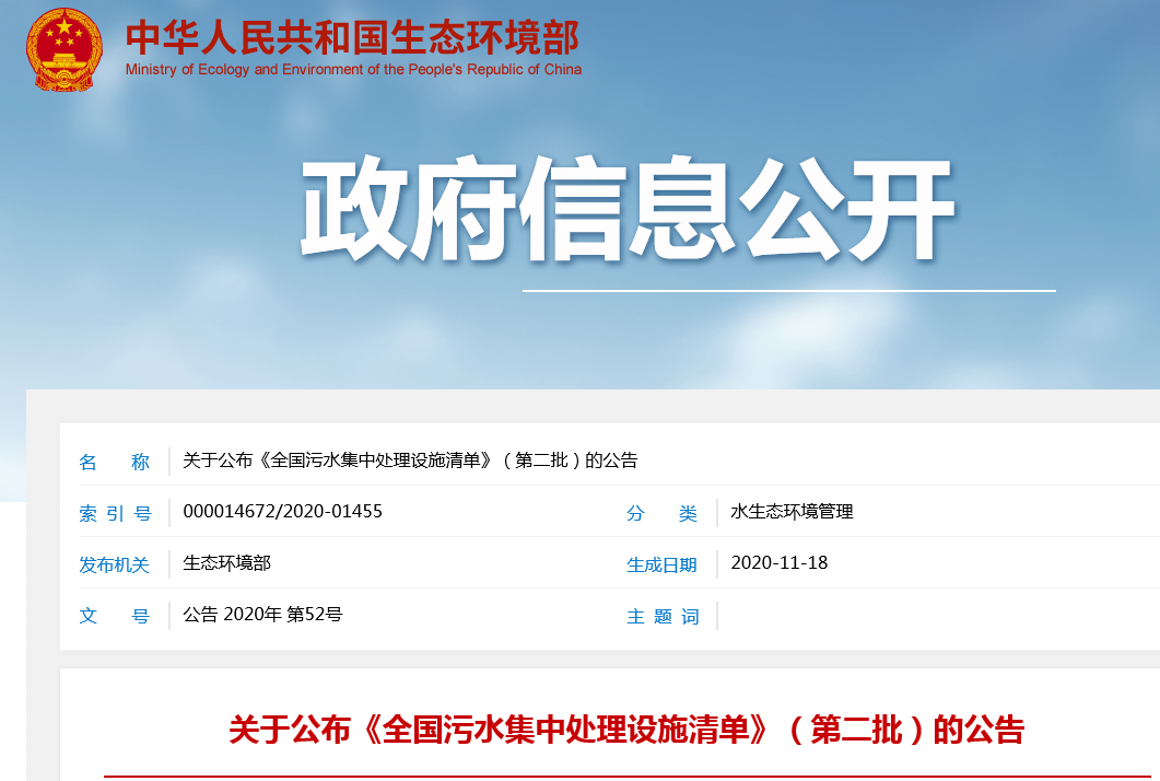 关于公布《全国污水集中处理设施清单》(第二批)的公告