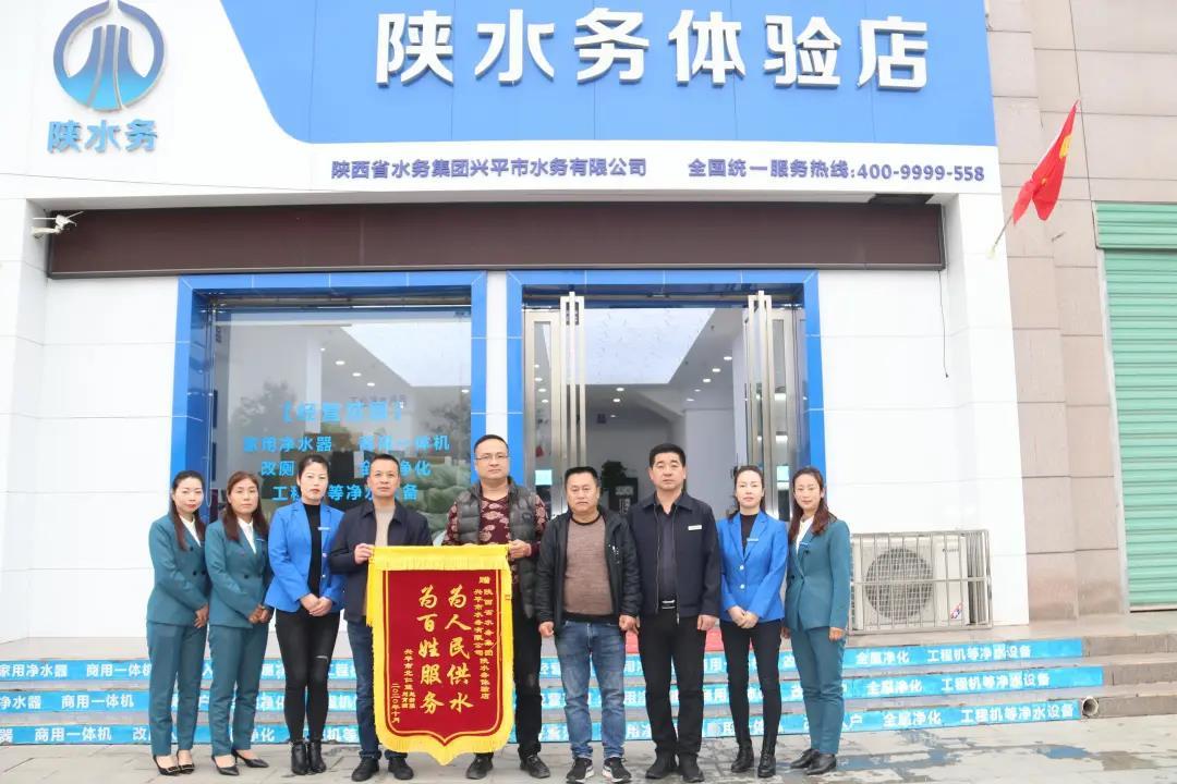 兴平市北仁堡村村民赵新强、刘育满将一面“为人民供水 为百姓服务”的锦旗送到体验店,以感谢她们让北仁堡村民喝上了价格实惠的优质好水。