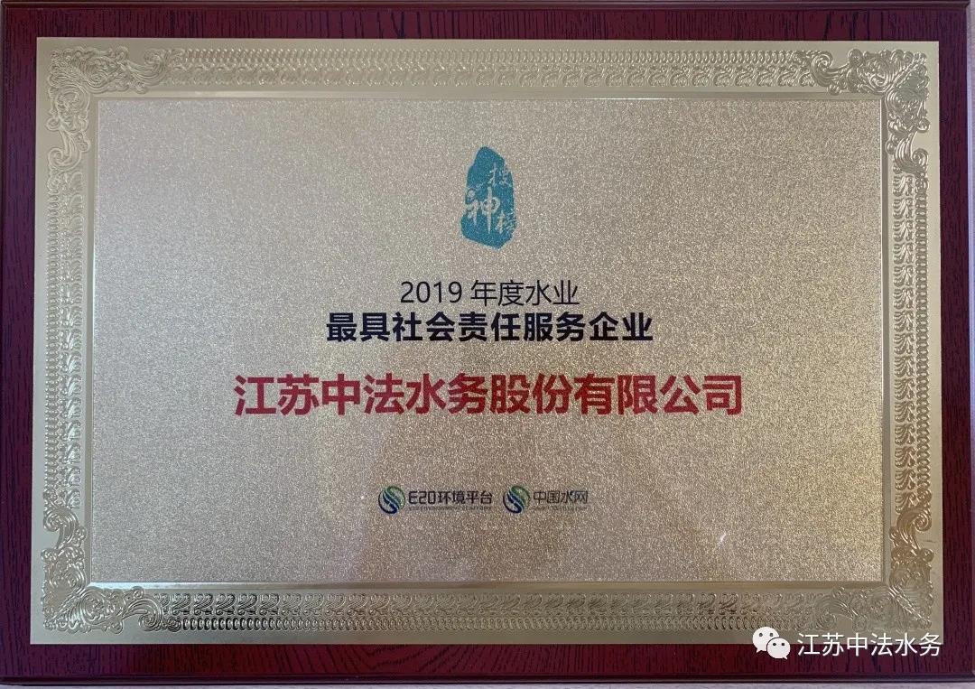 公司荣获“2019年度中国水业最具社会责任服务企业”称号。