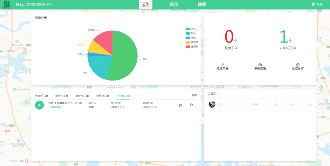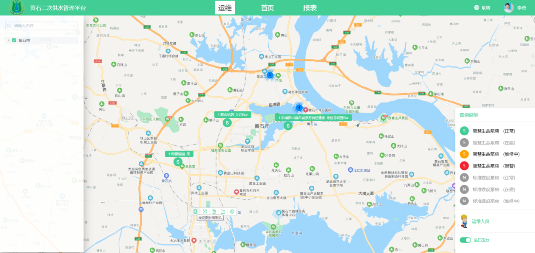 开启“千里眼”模式,提升服务质量工作人员可以通过网页、手机APP、微信小程序等渠道,接入该平台,24小时实时监控二次供水泵房设备设施的运行状态。且随着接入泵房数量的增加,黄石市自来水有限公司将通过数据分析/预警、电子巡检和人工巡检相结合的方式,进一步降低运维成本,有效解决设备多、维护难、无法及时响应等痛点,变被动为主动,提高供水服务质量。
