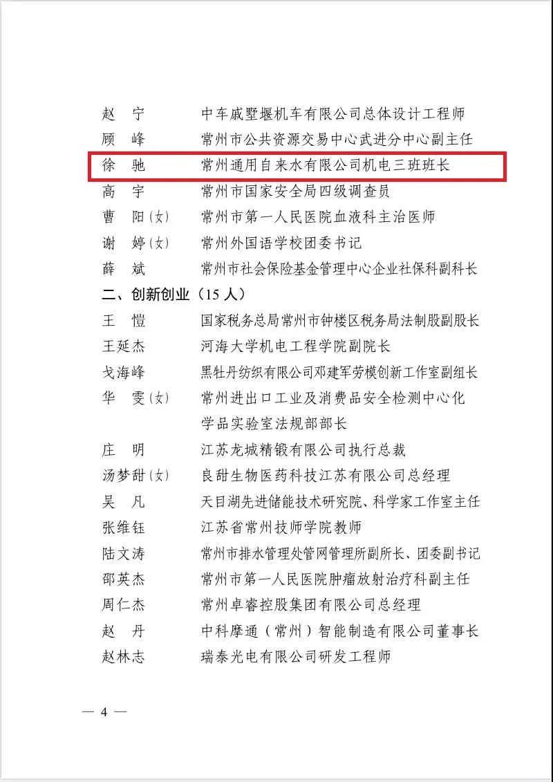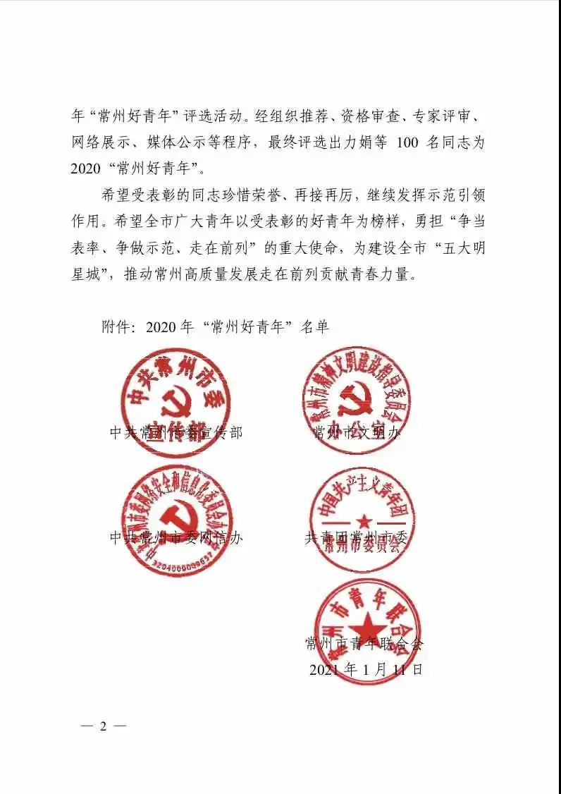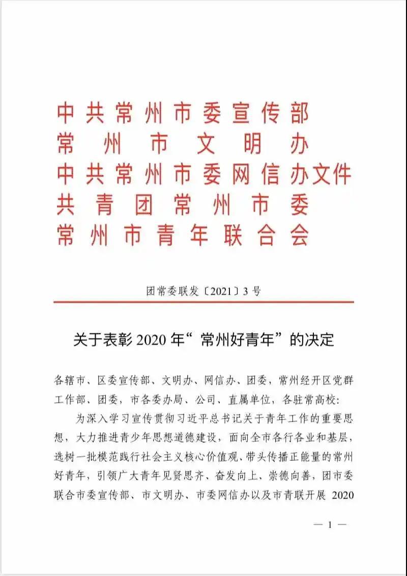 常水青年徐驰入选2020年“常州好青年”,获评“爱岗敬业”好青年。