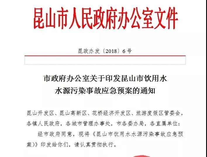 制定应急预案:为做好昆山市供水突发事件应急处置工作,指导和应对可能发生的供水安全事件,及时、有序、高效地开展事件抢险和救援工作,最大限度地减少事件可能造成的损失,保护人民生命财产安全,维护公共安全和社会稳定,保障经济社会和谐有序发展。制定《昆山市饮用水水源污染事故应急预案》《昆山市供水突发事件应急预案》《昆山市供水系统突发事件应急处置技术预案》等相关应急预案。