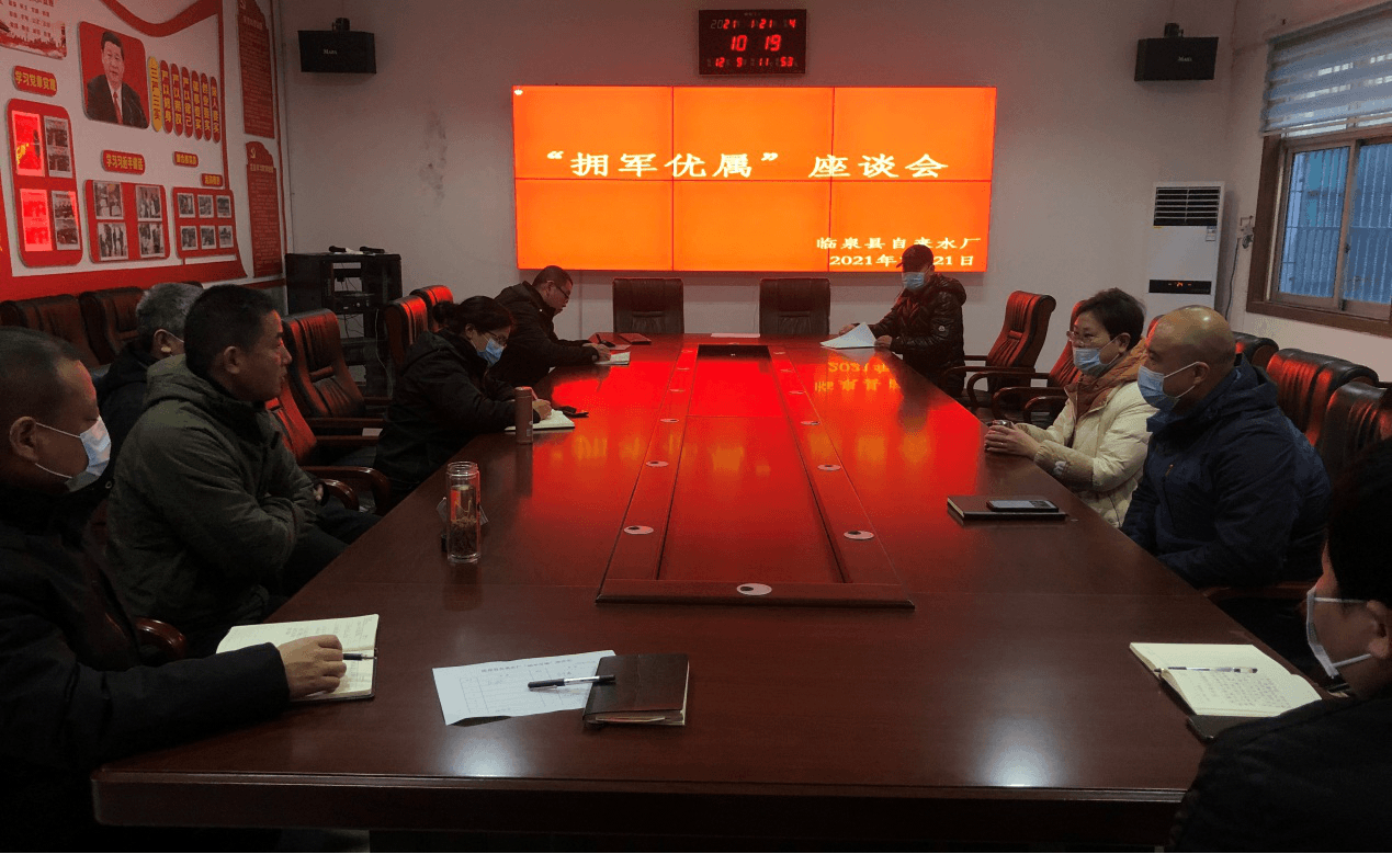 为深入学习贯彻习近平总书记关于“双拥”重要论述和指示批示精神,大力弘扬拥军优属、拥政爱民的光荣传统,根据临泉县人民政府办公室《关于做好2021年元旦、春节期间拥军优属拥政爱民工作的通知》(临政办秘〔2020〕100号)文件精神,临泉县自来水厂周密部署,积极开展了元旦春节期间拥军优属走访慰问活动。
