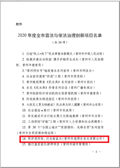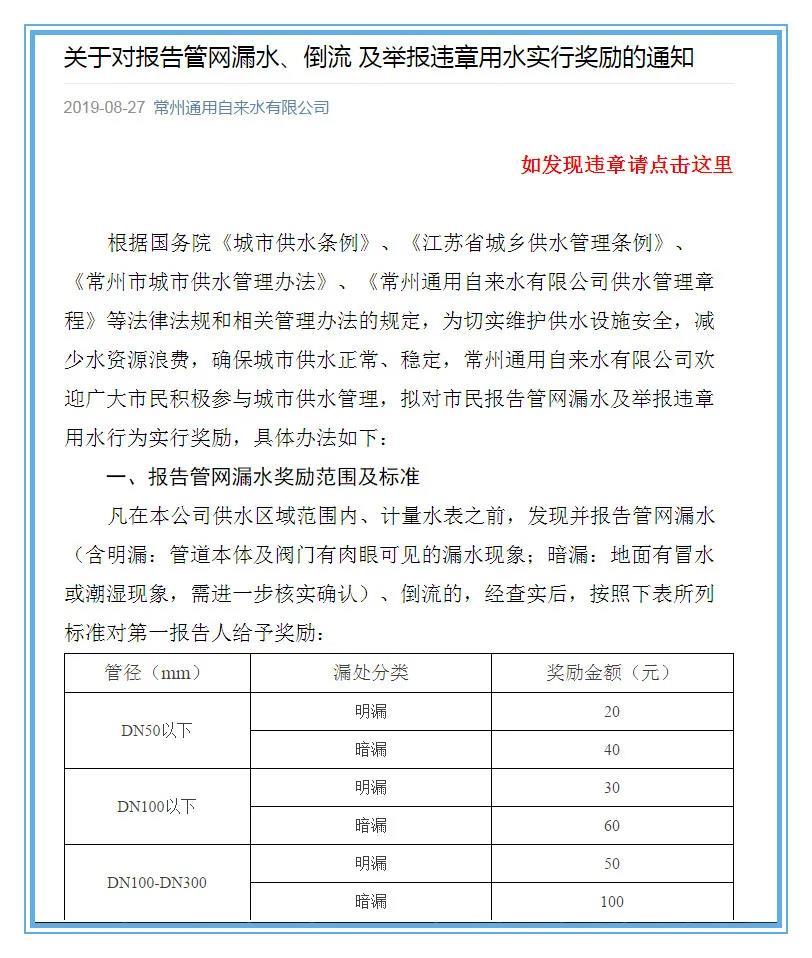 建章立制 规范用水秩序为规范我市供水秩序,保护消防栓,根据《城镇供水法》,公司及时制定下发了《常州通用自来水有限公司关于对报告管网漏水、倒流及举报违章用水试行奖励办法》,对举报违章用水线索经查属实的第一举报人,给予追缴水费额10-20%的奖励,并为举报人保密。对私开消防栓非法取水金额较大情节严重的车牌所有人及所属单位诉至法院,列入征信黑名单。